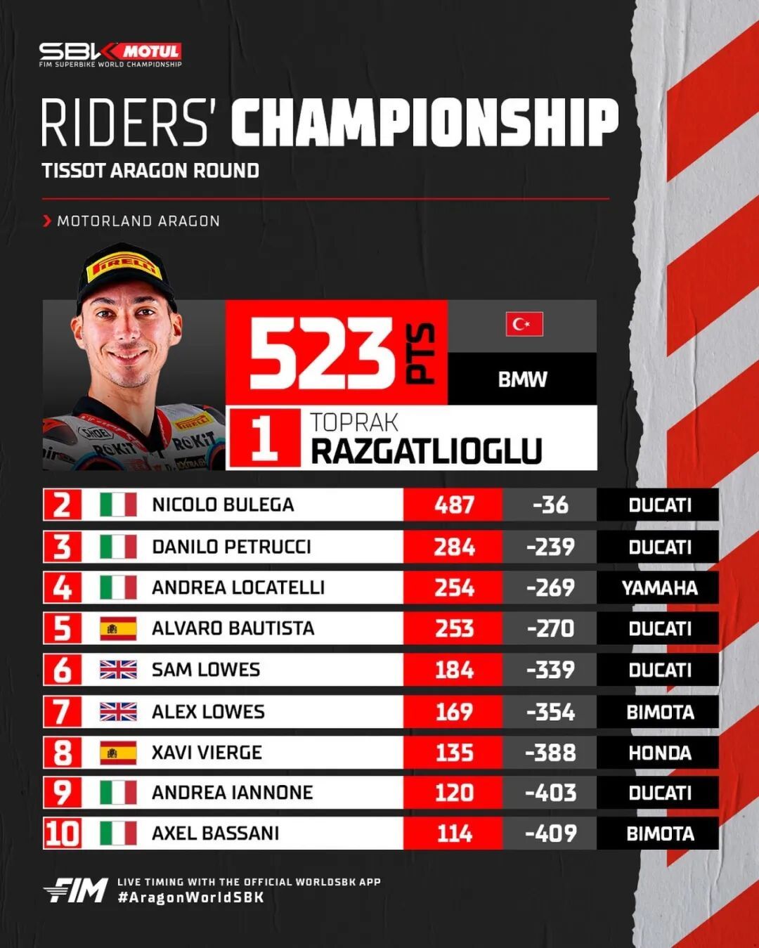 The highly anticipated WSBK Round 10 concluded at the Aragon Circuit in Spain, where reigning champion Toprak once again delivered an extraordinary performance, equaling his own record of thirteen consecutive wins, the longest in WSBK history, set last year. Prior to this event, Toprak had never won at the Aragon Circuit, but his results of one victory and two second-place finishes have once again set multiple historical records, allowing him to maintain a strong lead in the points standings with a 36-point advantage.